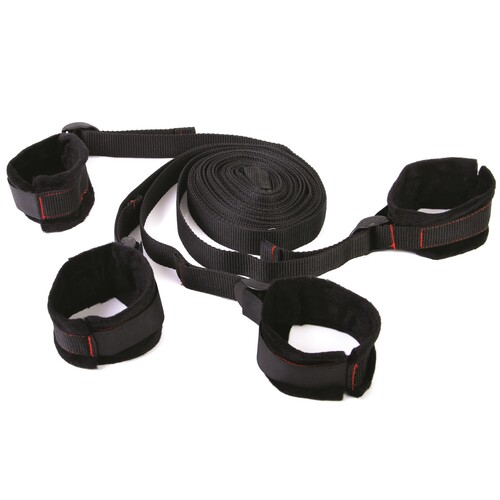 Tranform any bed into a bondage playground in seconds. Includes 4 cuffs, 4 straps & connector strap. No hardware needed. Sex toys at Adam & Eve.
