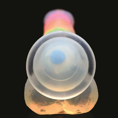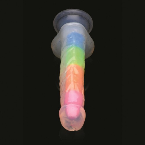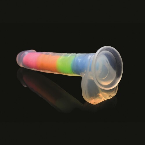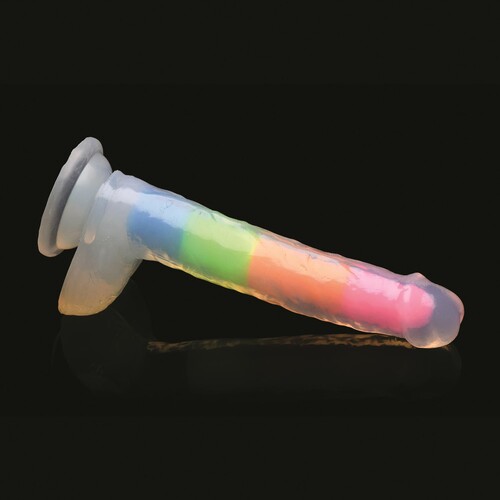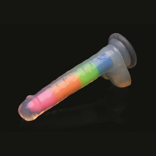 Light up your night with this rainbow glow in the dark dildo with balls! Dual-density firm inner core with soft outer skin feels so real. Great low price!