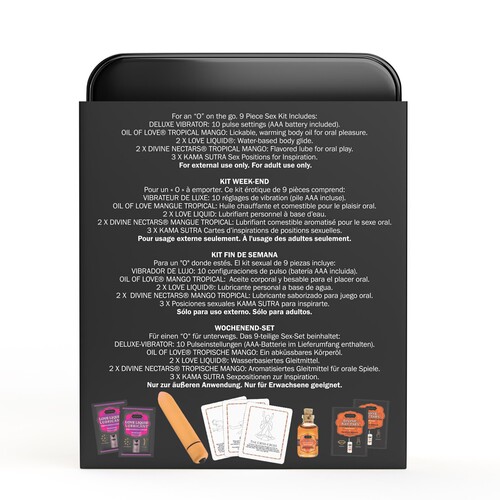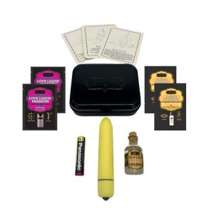 Unpack sexy romance with this naughty weekend getaway kit! Includes 10-function bullet vibe, kissable body oil, flavored lube, glide, cards, and more!